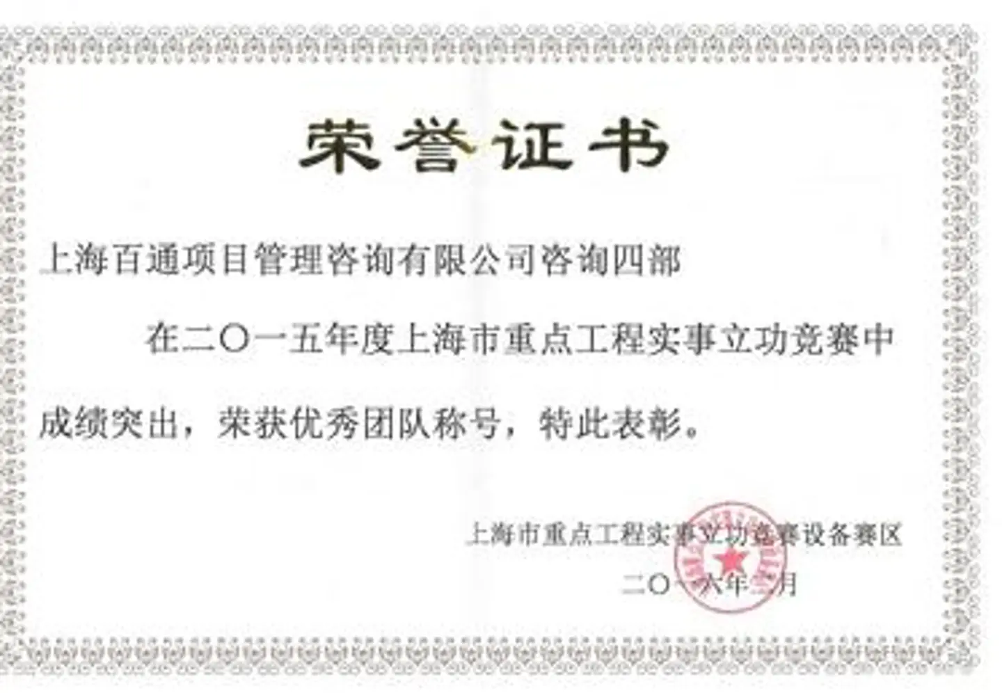 在2015-2016年度,我司全體員工上下一心、團(tuán)結(jié)拼搏、眾志成城,在市重點(diǎn)工程項(xiàng)目上作出了突出貢獻(xiàn),取得了優(yōu)異的成績(jī)。在市重點(diǎn)工程實(shí)事立功競(jìng)賽設(shè)備賽區(qū)評(píng)比活動(dòng)中,得了評(píng)委會(huì)的高度肯定。在此次工作交流會(huì)上,市競(jìng)賽辦、市重點(diǎn)工程實(shí)事立功競(jìng)賽設(shè)備賽區(qū)相關(guān)領(lǐng)導(dǎo)為優(yōu)秀公司及個(gè)人頒獎(jiǎng)。我司被授予上海市重點(diǎn)工程實(shí)事立功競(jìng)賽設(shè)備賽區(qū)“優(yōu)秀企業(yè)”榮譽(yù)稱號(hào);我司咨詢四部被授予“優(yōu)秀團(tuán)隊(duì)”榮譽(yù)稱號(hào);我司于樹軒同志、張國(guó)強(qiáng)同志被授予“優(yōu)秀建設(shè)者”榮譽(yù)稱號(hào)。