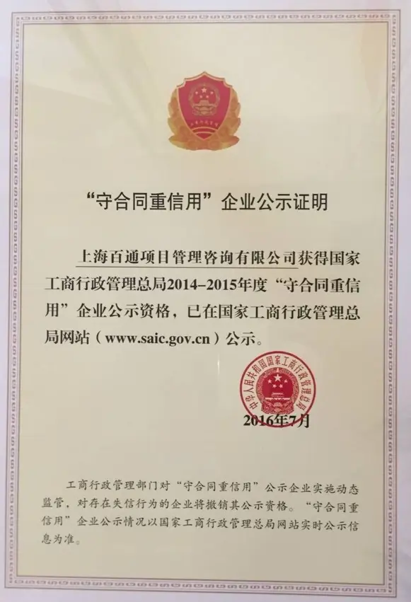 此次,在國家工商行政管理總局公布的2014-2015年度全國“守合同重信用”公示企業名單中,上海市共有300家企業,浦東新區僅有38家企業名列其中,我司有幸成為這38家企業之一。獲此殊榮是對我司長期以來誠信經營行為的肯定,我司將一如既往恪守誠信,保持榮譽,再創佳績,為本市企業信用建設再作貢獻!