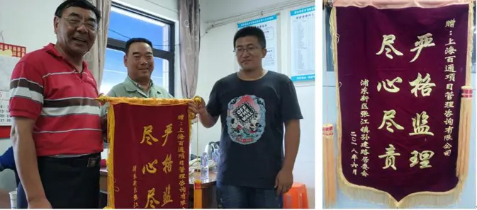 會(huì)后,浦東新區(qū)張江鎮(zhèn)孫建路居委會(huì)代表向上海百通項(xiàng)目管理咨詢有限公司贈(zèng)送錦旗一面,特此表?yè)P(yáng)現(xiàn)場(chǎng)監(jiān)理人員的優(yōu)秀工作成果。