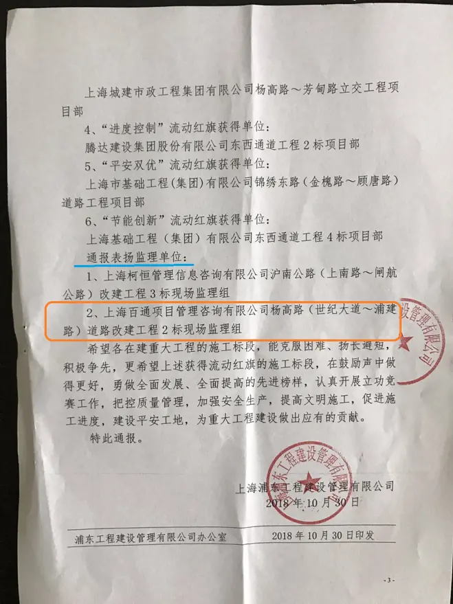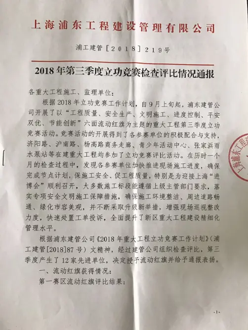2018年9月,浦東建管公司開展了以“工程質量、安全生產、文明施工、進度控制、平安雙優、節能創新”為主題的重大工程第三季度立功競賽活動。在這次立功競賽檢查評比活動中,我司楊高路道路改建工程監理組獲通報表揚。