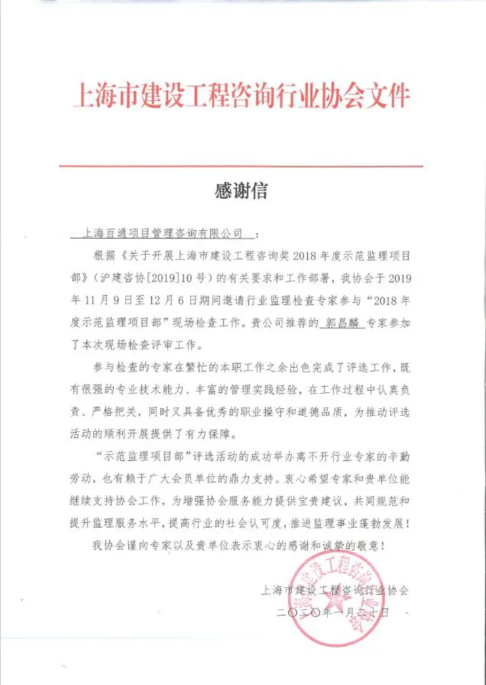 我司監(jiān)理三部部門經(jīng)理、總監(jiān)郭昌麟同志獲上海市建設(shè)工程咨詢行業(yè)協(xié)會(huì)感謝信,表?yè)P(yáng)其在2018年度示范監(jiān)理項(xiàng)目現(xiàn)場(chǎng)檢查工作中,作為評(píng)審專家,以扎實(shí)的專業(yè)技術(shù)能力和豐富的管理實(shí)踐經(jīng)驗(yàn),出色完成評(píng)選工作,為推動(dòng)評(píng)選工作的順利開(kāi)展提供了有力保障。同時(shí),協(xié)會(huì)也感謝了我司對(duì)“示范監(jiān)理項(xiàng)目”評(píng)選活動(dòng)的鼎力支持。