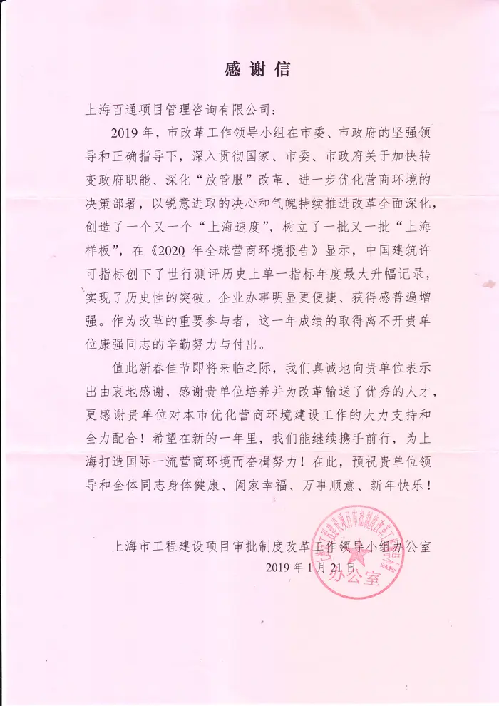 我司代建二部部門經(jīng)理康強(qiáng)同志獲上海市工程建設(shè)項(xiàng)目審批制度改革工作領(lǐng)導(dǎo)小組辦公室感謝信,表?yè)P(yáng)其在市委、市政府加快轉(zhuǎn)變政府職能,深化“放管服”改革的一系列工作中,作為改革的重要參與者,在相關(guān)部門掛職鍛煉期間付出的辛勤努力。同時(shí),也對(duì)我司培養(yǎng)輸送優(yōu)秀人才,支持和配合本市優(yōu)化營(yíng)商環(huán)境建設(shè)工作表達(dá)了衷心感謝。