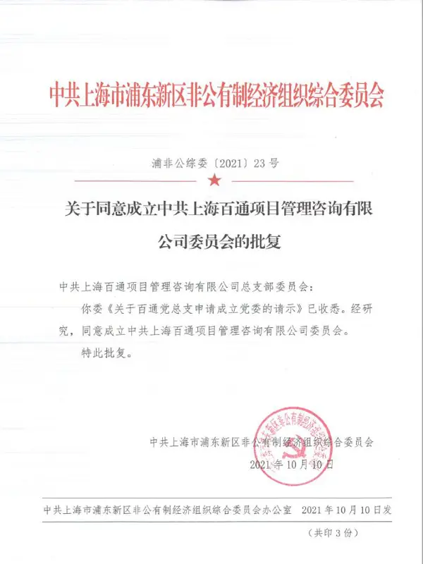 近日,經上級黨組織中共上海市浦東新區非公有制經濟組織綜合委員會研究,批復同意我司成立中共上海百通項目管理咨詢有限公司委員會。下一步,百通黨委班子選舉工作小組將在上級黨組織的指導下,按組織管理規定開展黨委班子選舉工作。