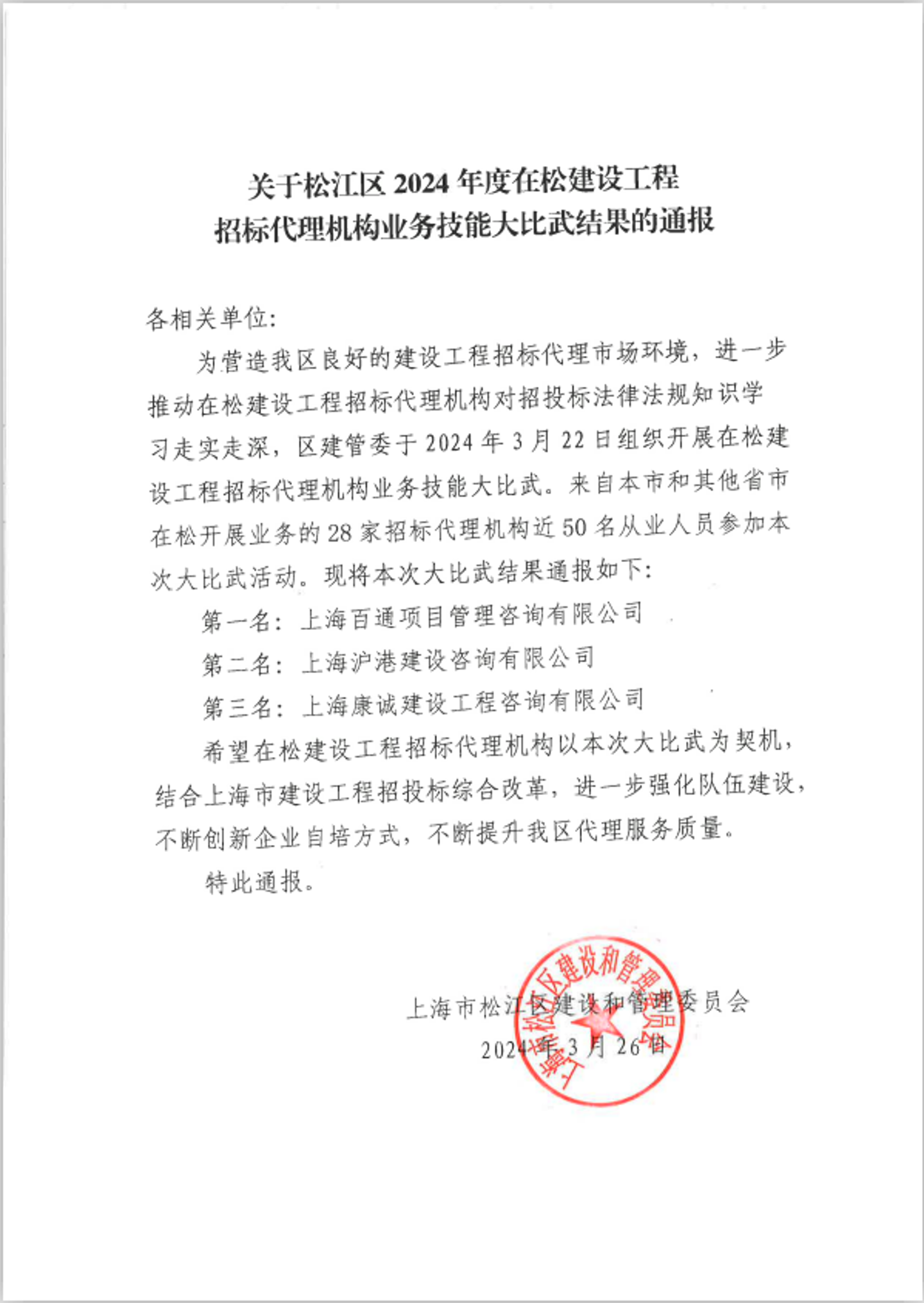2024年3月22日,招標(biāo)代理板塊參加了由松江區(qū)建管委組織的2024年度在松建設(shè)工程招標(biāo)代理機(jī)構(gòu)業(yè)務(wù)技能大比武。浦西分部經(jīng)理陳佳燕帶領(lǐng)部門(mén)員工朱俊龍聯(lián)合咨詢五部張然組成團(tuán)隊(duì)代表公司參戰(zhàn)。經(jīng)過(guò)激烈的角逐,最終我司團(tuán)隊(duì)在參加比武的28家招標(biāo)代理機(jī)構(gòu)近50名從業(yè)人員中獲得了第一名的喜人成績(jī)。這是我司繼2019年度取得松江建設(shè)工程招標(biāo)代理業(yè)務(wù)大比武第一名榮譽(yù)后,再次奪得此項(xiàng)殊榮。