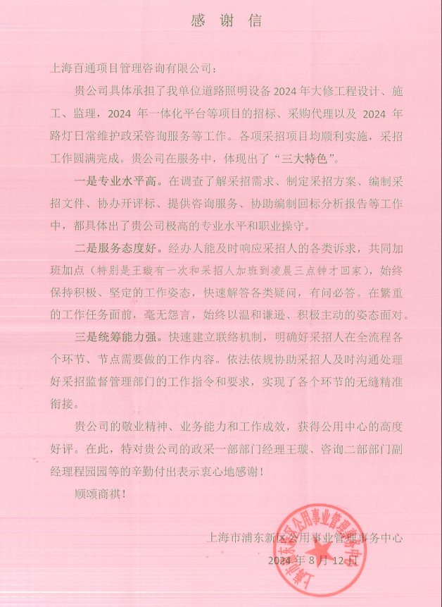 “質(zhì)量月”活動(dòng)期間涌現(xiàn)了一批先進(jìn)典型人物,在高質(zhì)量發(fā)展中發(fā)揮了中堅(jiān)帶頭作用。如近日,我司獲上海市浦東新區(qū)公用事業(yè)管理事務(wù)中心致函感謝,盛贊我司在道路照明設(shè)備大修、2024年一體化平臺(tái)項(xiàng)目招標(biāo)及采購(gòu)代理、路燈日常維修咨詢(xún)服務(wù)中的卓越表現(xiàn)。感謝信特別肯定了我司在專(zhuān)業(yè)水平、服務(wù)態(tài)度與統(tǒng)籌能力方面的杰出貢獻(xiàn),并對(duì)招標(biāo)代理板塊王璇經(jīng)理及咨詢(xún)二部程園園副經(jīng)理的辛勤付出表示衷心感謝。