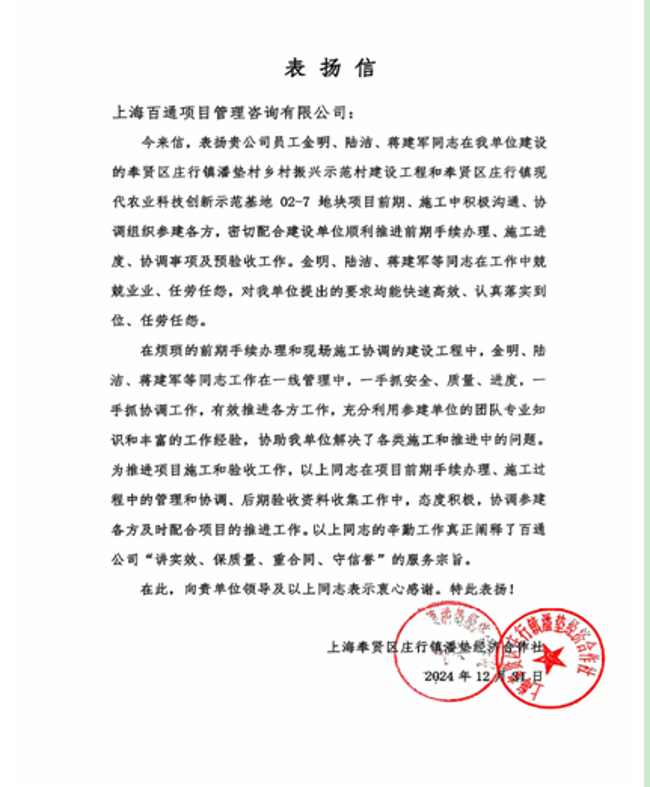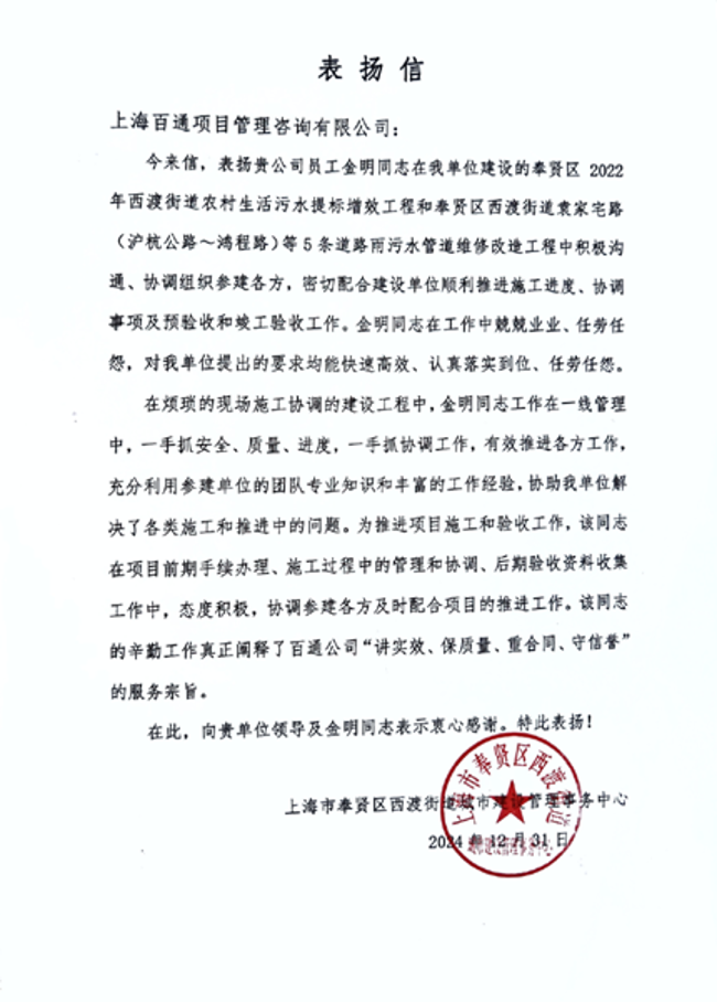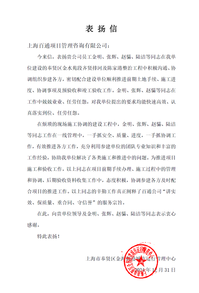 我司收到上海體育大學、上海臨港新片區管委會、上海浦東新區合慶鎮人民政府、上海奉賢區街鎮等單位發來的表揚信以及上海市水務局(上海市海洋局)、上海市水利工程協會發來的榮譽證書,信中感謝公司的大力支持,對我司項目管理板塊員工在服務過程中展現高度的責任心、專業的素養給予好評,充分展現了項目管理團隊以專業鑄就品質,服務贏得滿意的宗旨。