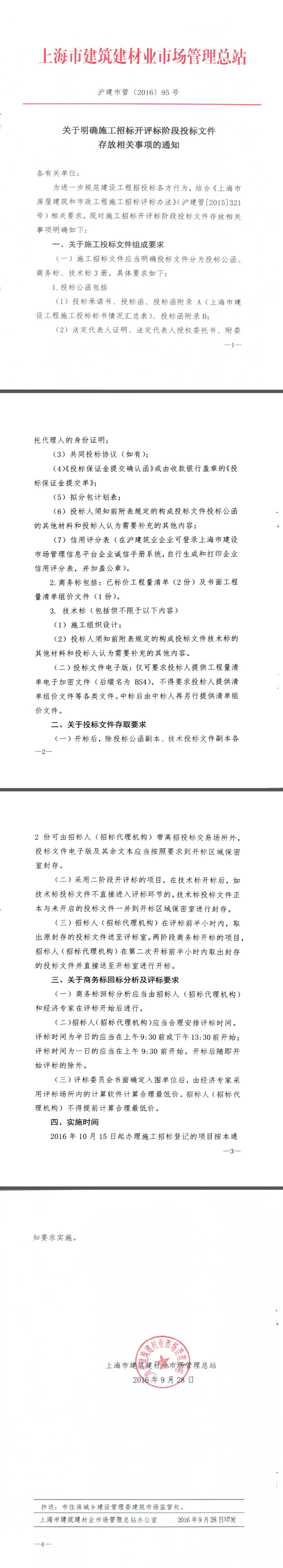 关于明确施工招标开评标阶段投标文件存放相关事项的通知(沪建市管[2016]95号)