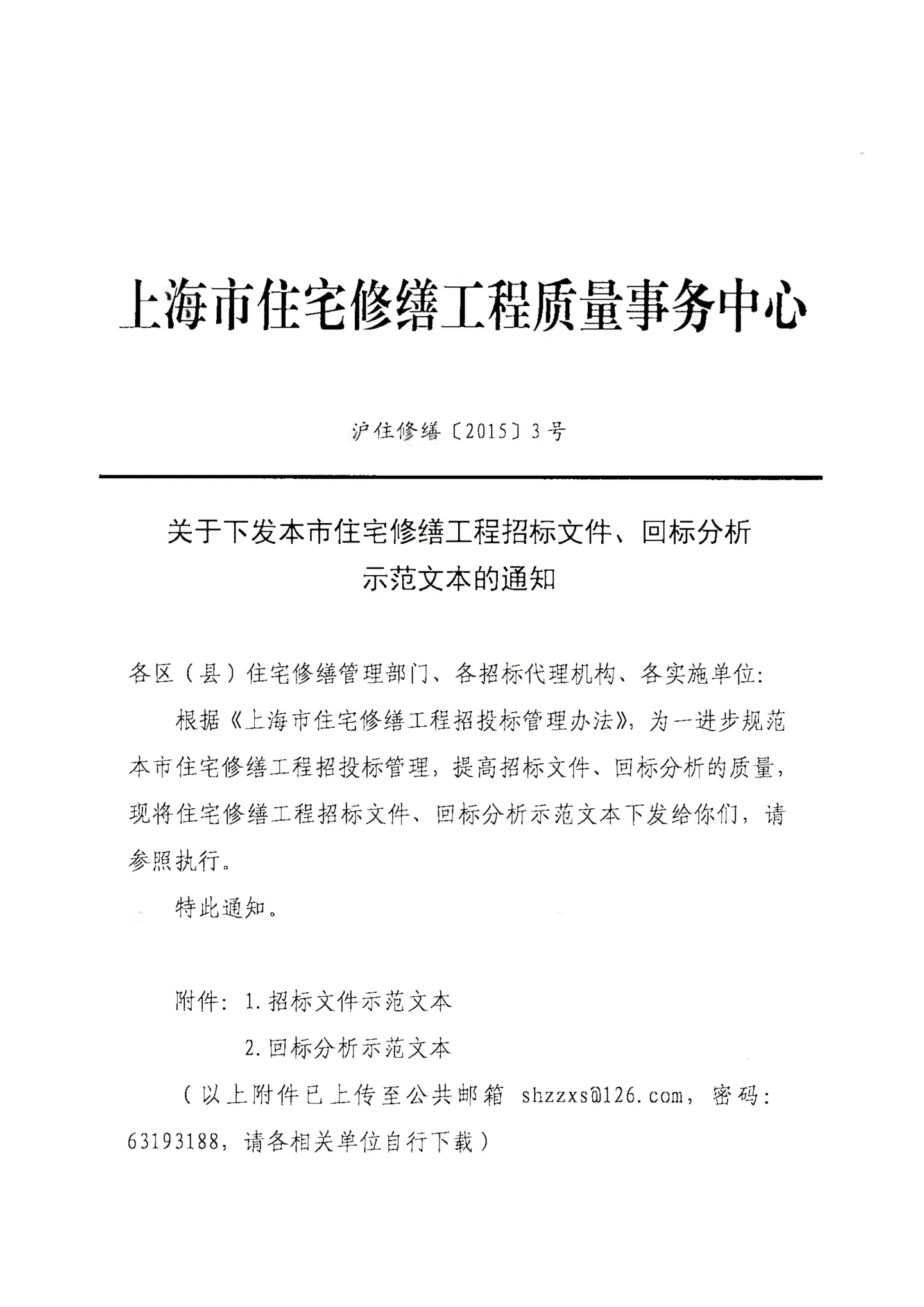 关于下发本市住宅修缮工程招标文件、回标分析、示范文本的通知(沪住宅修缮[2015]3号)