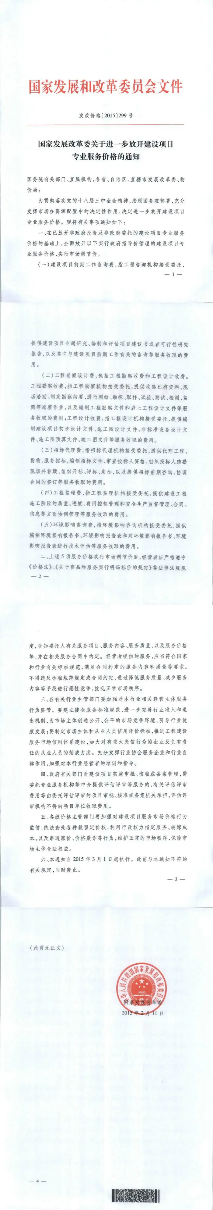 [发改委] 关于进一步放开建设项目专业服务价格的通知【发改价格[2015]299号】