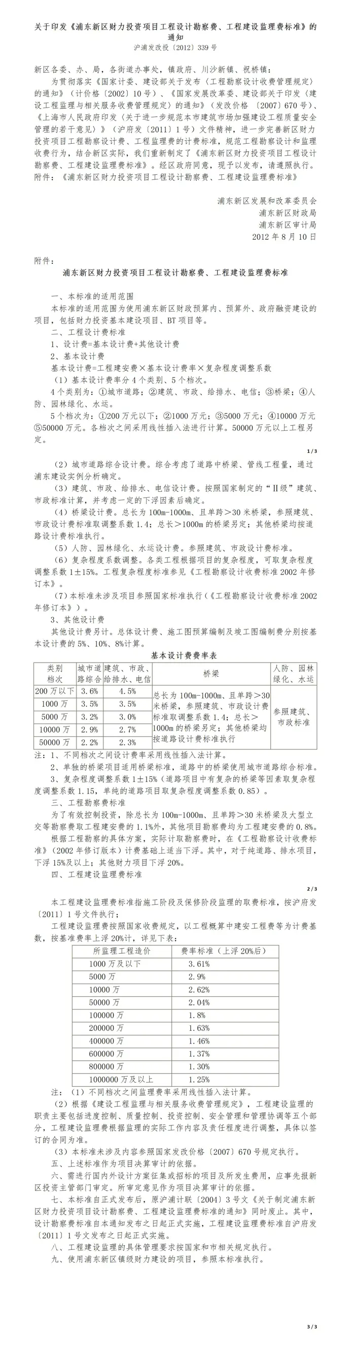 关于印发《浦东新区财力投资项目工程设计勘察费、工程建设监理费标准》的通知【沪浦发改投〔2012〕339号】