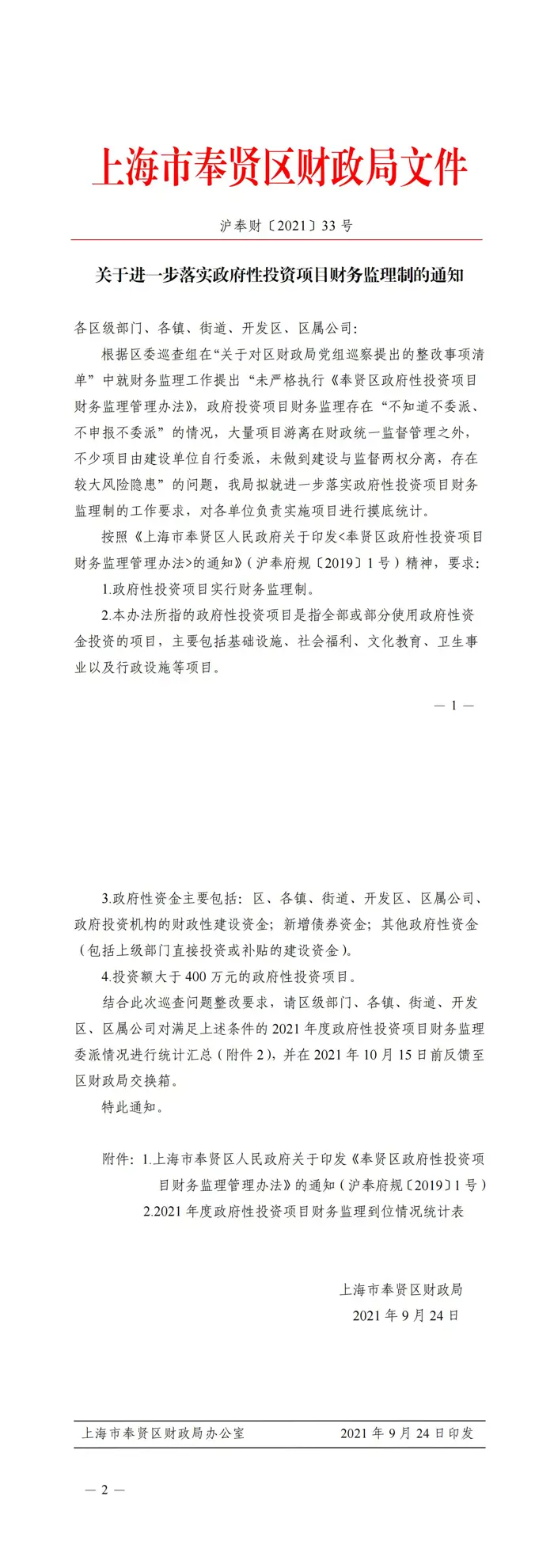 [奉贤]关于进一步落实政府性投资项目财务监理制的通知【沪奉财〔2021〕33号】