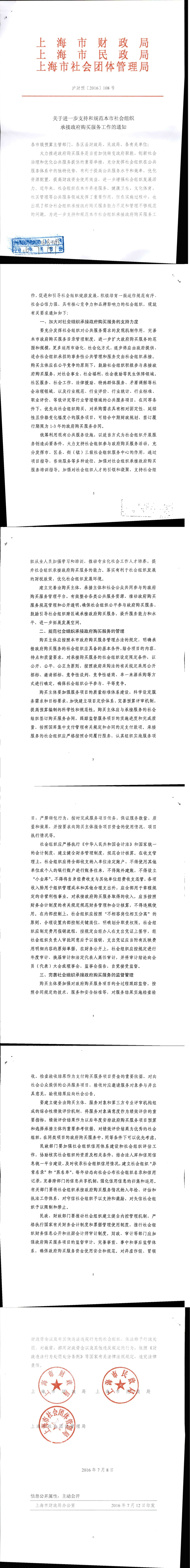 关于进一步支持和规范本市社会组织承接政府购买服务工作的通知(沪财预〔2016〕108号)