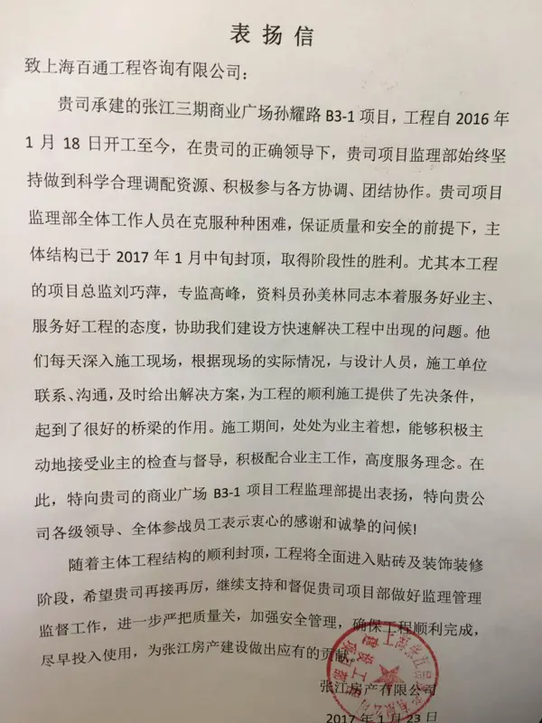 我司監(jiān)理的張江三期商業(yè)廣場(chǎng)孫耀路B3-1項(xiàng)目監(jiān)理部近日收到業(yè)主方表?yè)P(yáng)信。信中表?yè)P(yáng)了由劉巧萍總監(jiān)帶領(lǐng)的監(jiān)理項(xiàng)目部,自項(xiàng)目2016年1月開工以來(lái),嚴(yán)格履行監(jiān)理職責(zé),強(qiáng)化監(jiān)理服務(wù)意識(shí),積極協(xié)調(diào)各方關(guān)系,及時(shí)解決工程中出現(xiàn)的問(wèn)題,嚴(yán)把質(zhì)量、安全兩道關(guān),現(xiàn)場(chǎng)監(jiān)理工作表現(xiàn)突出,成績(jī)顯著(尤其提到工作表現(xiàn)突出的總監(jiān)劉巧萍、專監(jiān)高峰、資料員孫美林三位同志),特向我司張江商業(yè)廣場(chǎng)B3-1項(xiàng)目監(jiān)理部提出表?yè)P(yáng)。