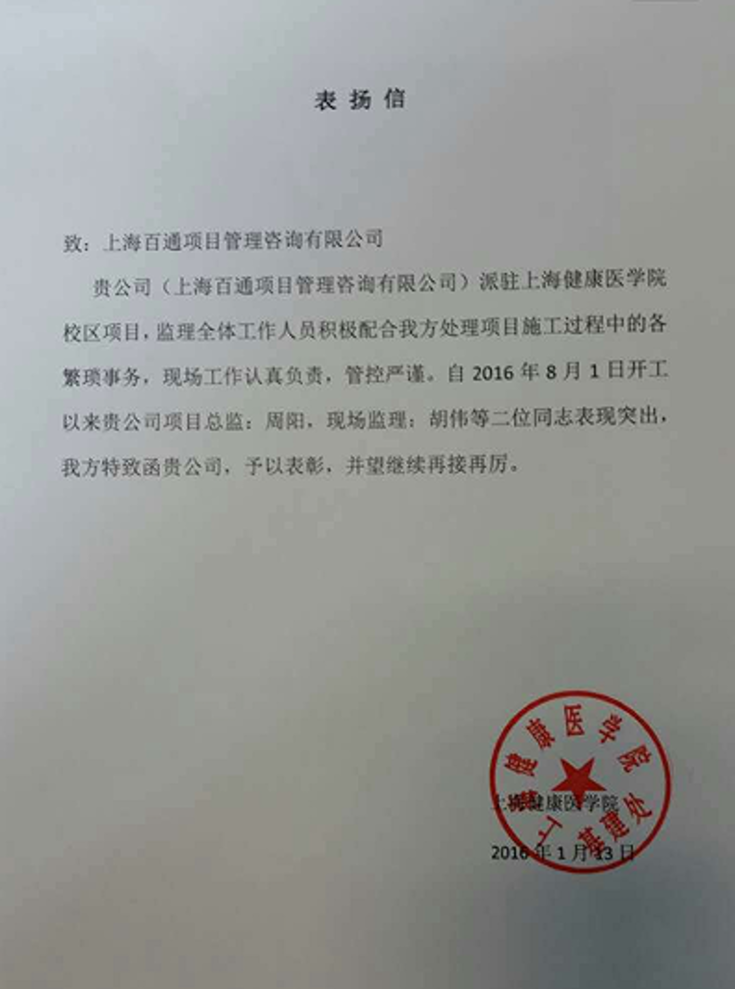 貴公司(上海百通項目管理咨詢有限公司)派駐上海健康醫(yī)學(xué)院校區(qū)項目,監(jiān)理全體工作人員積極配合我方處理項目施工過程中的各繁瑣事務(wù),現(xiàn)場工作認真負責,管控嚴謹。自2016年8月1日開工以來貴公司項目總監(jiān):周陽,現(xiàn)場監(jiān)理:胡偉等二位同志表現(xiàn)突出,我方特致函貴公司,予以表彰,并望繼續(xù)再接再厲。