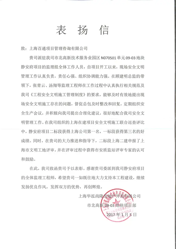 在此,我司致函貴司予以表彰。感謝貴司委派到我司靜安府項目的全體監理工程師,希望貴司一如既往地大力支持本工程建設,繼續發揚優良作風,發揮雙方的優勢,再創輝煌。