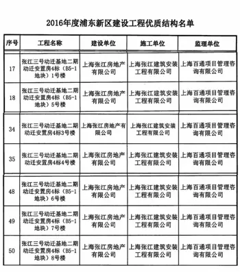 監理分公司項目張江三號動遷基地二期B5-1地塊配套商品房建設工程1#樓、3#樓、4#樓、5#樓、6#樓、7#樓、8#樓(7棟樓),經浦東新區建設工程優質結構評審委員會評審,被評為2016年浦東新區建設工程優質結構。