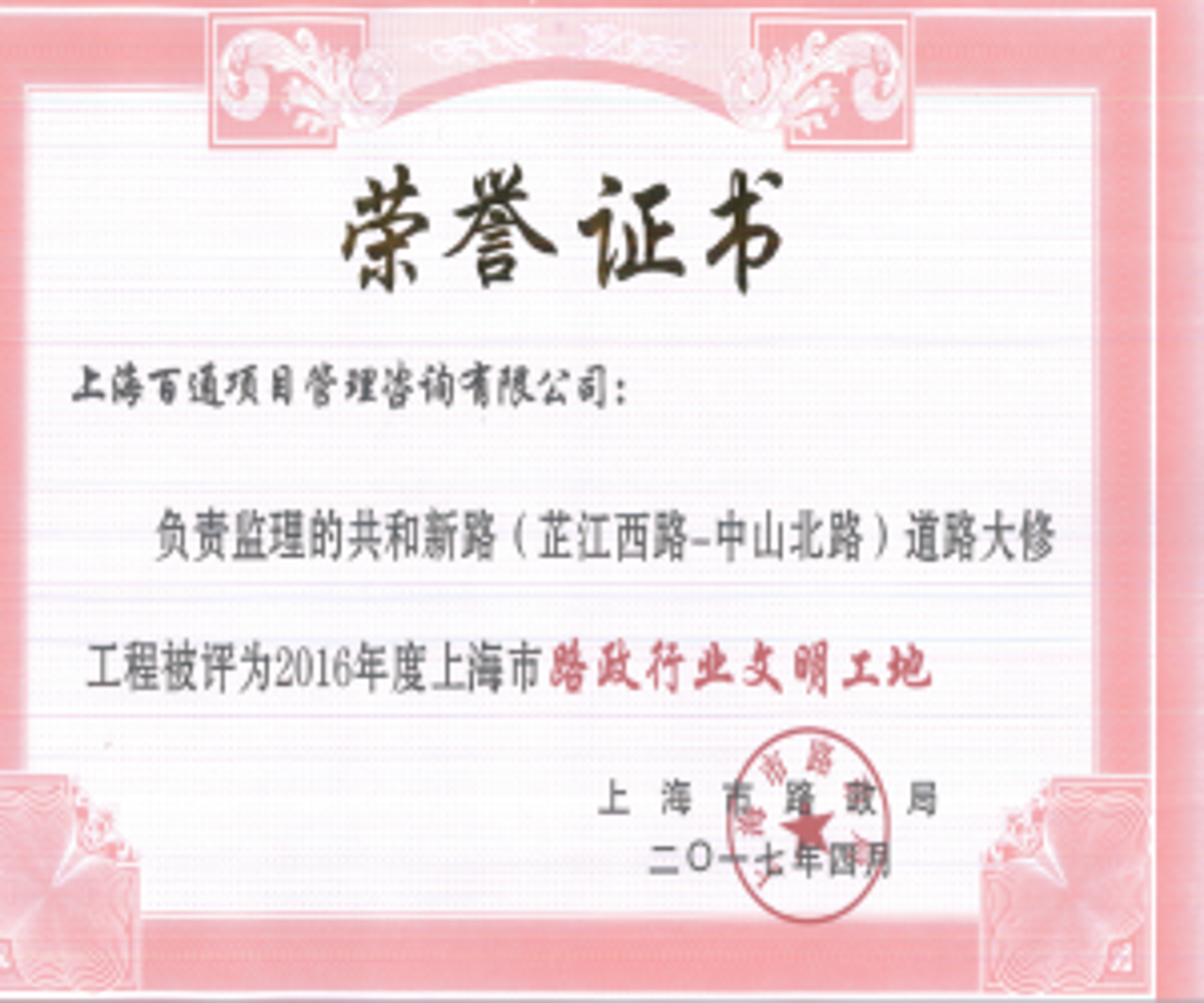 共和新路大修工程(本標(biāo)段)于2016年10月開(kāi)工建設(shè),在工程施工準(zhǔn)備階段,主管單位靜安區(qū)市政工程和配套管理中心提出,以建設(shè)“市文明工地”為目標(biāo),高效、安全、高質(zhì)量地完成共和新路大修工程。我司積極響應(yīng),派駐總監(jiān)及各專(zhuān)業(yè)監(jiān)理工程師組成一支強(qiáng)有力、工作高效的項(xiàng)目監(jiān)理組,負(fù)責(zé)現(xiàn)場(chǎng)監(jiān)理工作。項(xiàng)目監(jiān)理組以“5+2”、“白+黑”24小時(shí)不間斷的服務(wù)理念,為工程的順利實(shí)施提供服務(wù)。工程建設(shè)期間,市路政局、靜安市政工程和配套管理中心及各主管部門(mén)多次到現(xiàn)場(chǎng)指導(dǎo)工作,在各參建單位共同努力下,工程于2017年3月份通過(guò)驗(yàn)收,并被評(píng)為2016年度上海市“路政行業(yè)文明工地”。