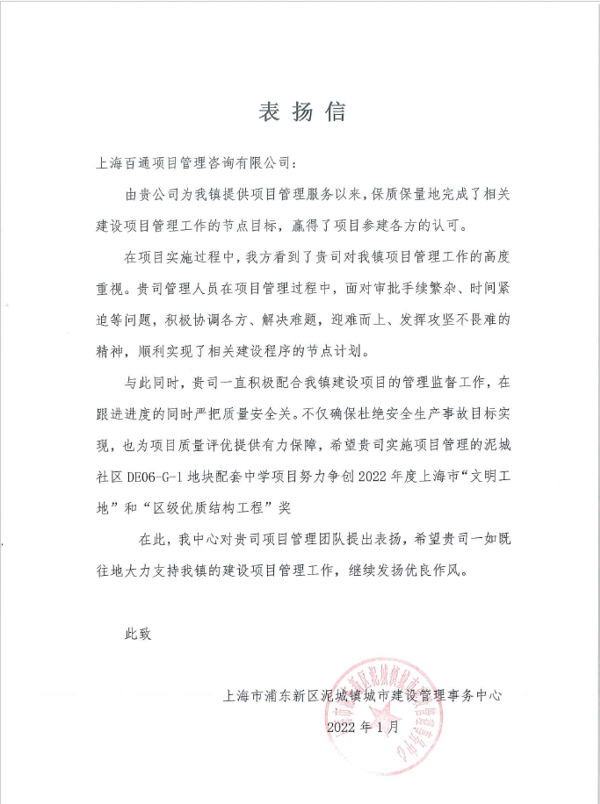 收到上海市浦東新區泥城鎮城市建設管理事務中心向項目管理團隊發來的感謝信,感謝團隊成員在項目管理過程中,面對審批手續繁雜、時間緊迫等問題,積極協調各方,解決難題、迎難而上,發揮攻堅不畏難的精神,順利實現了相關建設程序的節點計劃,保質保量完成任務,贏得了項目參建各方的認可。