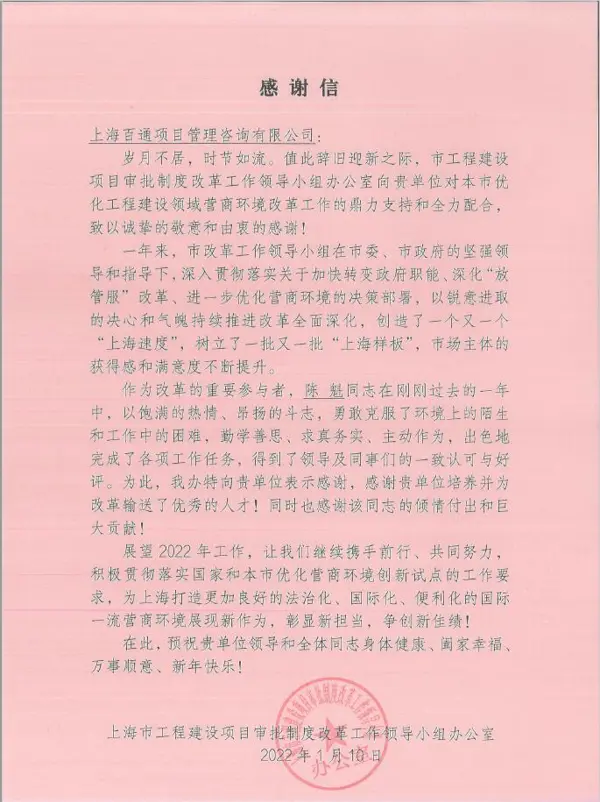 收到上海市工程建設項目審批制度改革工作領導小組辦公室向陳魁同志發來的感謝信,感謝陳魁同志作為改革的重要參與者,在過去的一年中以飽滿的熱情、昂揚的斗志,勇敢克服了環境上的陌生和工作中的困難,出色完成各項工作任務。信中同時感謝了我司培養并為改革輸送了優秀人才。