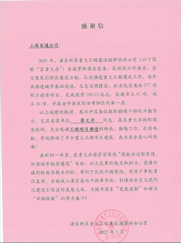 收到浦東新區重大工程建設指揮部辦公室向張又升同志發來的感謝信,感謝張又升同志在新區重大辦掛職鍛煉期間,充分發揮工程項目推進的特長,勤勉工作、扎實奉獻,有效推動了多個重大工程項目建設。