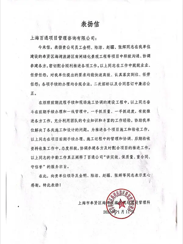 收到上海市奉賢區海灣旅游區規劃建設管理科向金明、陸潔、趙驦、張輝四位同志發來的感謝信,表揚四位同志在南閘綠化景觀工程等項目中積極溝通,協調參建各方,密切配合順利推進各項工作,闡釋了我司“講實效、保質量、重合同、守信譽”的服務宗旨。