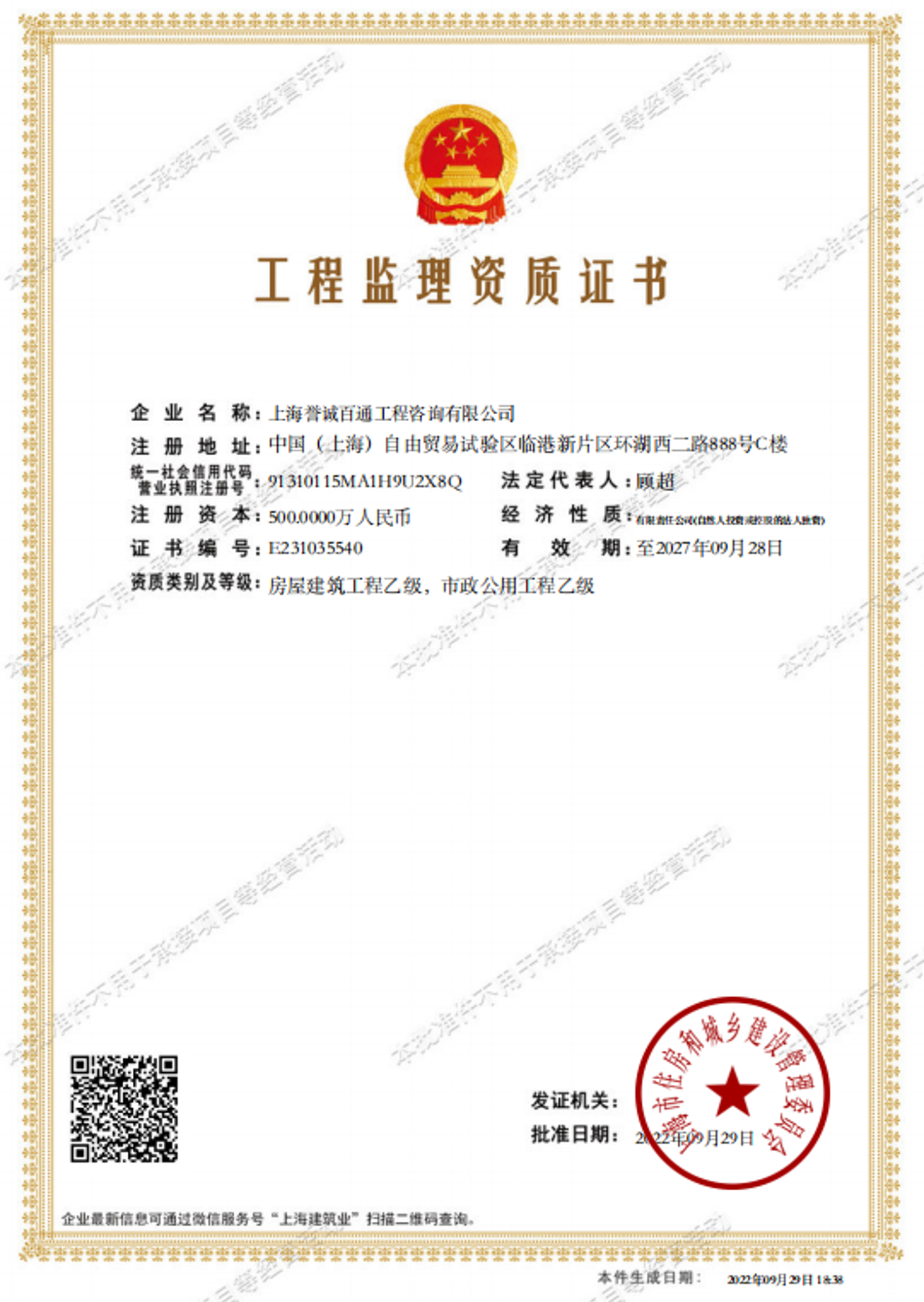 為堅決貫徹落實公司總體戰(zhàn)略發(fā)展規(guī)劃,在公司黨委、黨政領(lǐng)導(dǎo)班子的正確領(lǐng)導(dǎo)下,在監(jiān)理廣大員工的不懈努力和團(tuán)結(jié)協(xié)作下,近日,經(jīng)上海市住房和城鄉(xiāng)建設(shè)管理委員會批準(zhǔn),我司子公司——上海譽誠百通工程咨詢有限公司于2022年9月29日成功取得工程監(jiān)理“房屋建筑工程”、“市政公用工程”兩個專業(yè)的乙級資質(zhì)證書!