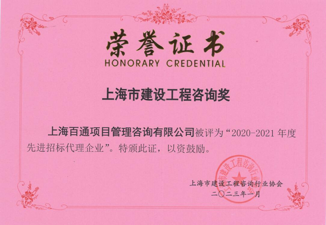蟬聯(lián)上海市建設(shè)工程咨詢行業(yè)協(xié)會授予的2020-2021年度“先進招標代理企業(yè)”、“先進造價咨詢企業(yè)”、“先進工程監(jiān)理企業(yè)”稱號