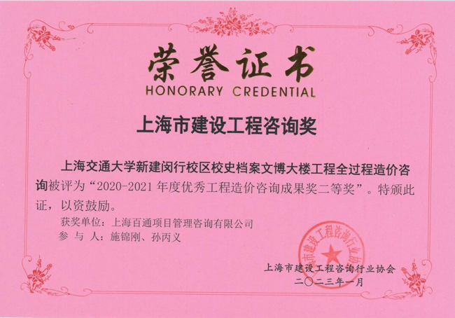 上海交通大學新建閔行校區(qū)校史檔案文博大樓工程全過程造價咨詢榮獲2020-2021年度“優(yōu)秀工程造價咨詢成果獎二等獎”