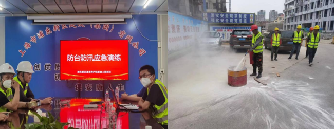 消防演練主要包括演練正確使用消防器材以及關(guān)于工地嚴(yán)禁明火施工、嚴(yán)禁吸煙的教育培訓(xùn)。防汛防臺(tái)演練則設(shè)有搶險(xiǎn)組、救援疏散組、安全保障組、通訊聯(lián)絡(luò)組四個(gè)小組,各組各司其職,井然有序。