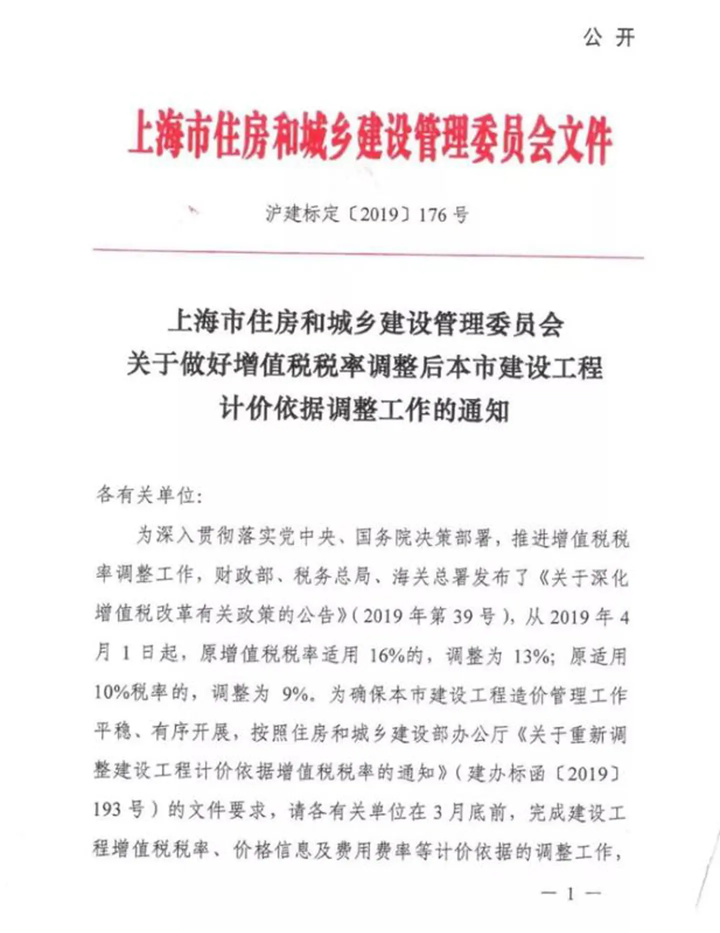 关于做好增值税税率调整后本市建设工程计价依据调整工作的通知 (沪建标定[2019]176号)