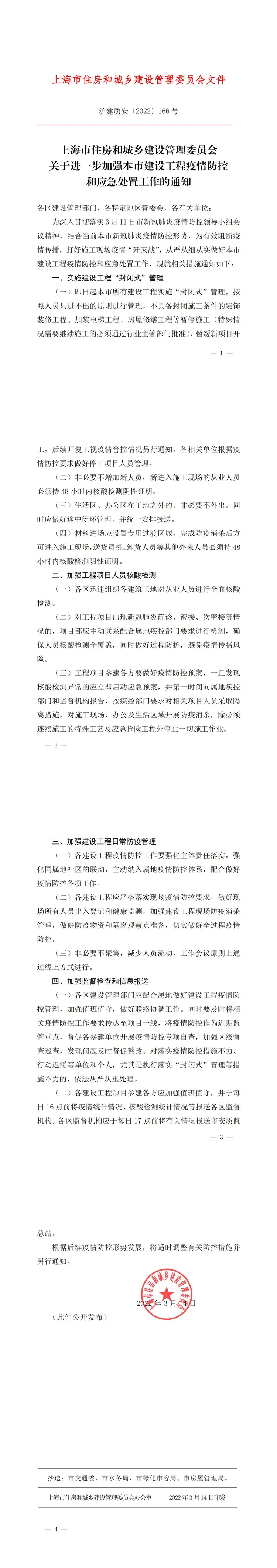 沪建质安【2022】166 号《关于进一步加强本市建设工程疫情防控 和应急处置工作的通知》