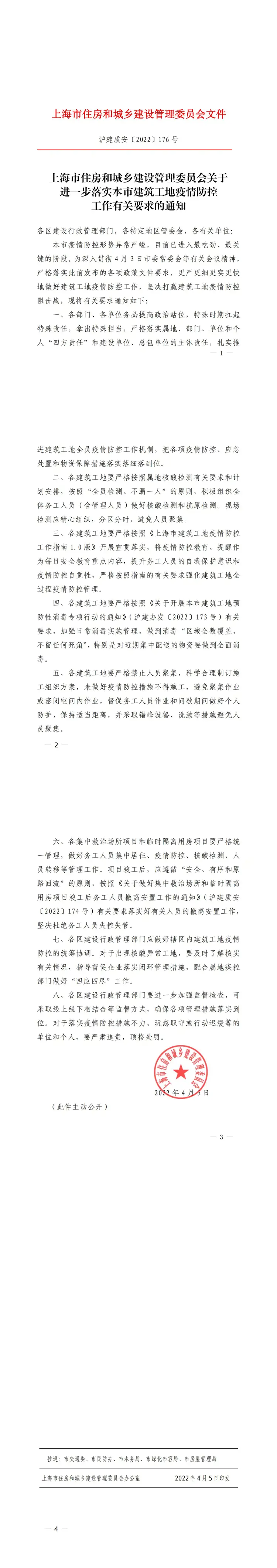 沪建质安〔2022〕176 号《上海市住房和城乡建设管理委员会关于 进一步落实本市建筑工地疫情防控 工作有关要求的通知》