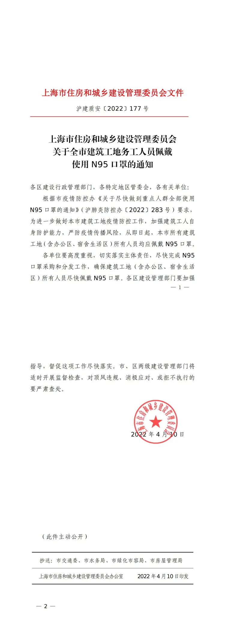沪建质安〔2022〕177 号《上海市住房和城乡建设管理委员会 关于全市建筑工地务工人员佩戴 使用 N95 口罩的通知》